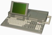 Amstrad introduced the PPC-640 in 1988 as a low-cost IBM-compatible portable. It weighed 22lbs. It ran on ten C batteries or mains power and offered a 320x200 flip-up monochrome screen.
