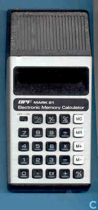 The APF MARK 21 is an arithmetic calculator with 8 digits precision and algebraic logic. It has 6 functions, 24 keys and a VFD (vacuum fluorescent) display. The power source is Sealed battery pack.
