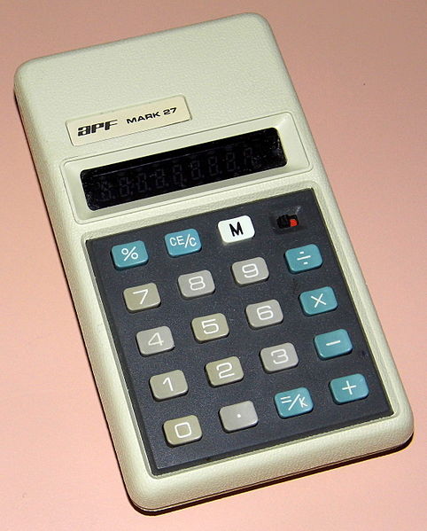 The APF MARK 27 is an arithmetic calculator with 8 digits precision and algebraic logic. It has 5 functions, 19 keys and a VFD (vacuum fluorescent) display. The power source is PP3 9V. The calculator was manufactured in USA.