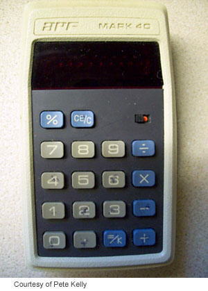 The APF MARK 40 is an arithmetic calculator with 8 digits precision and algebraic logic. It has 5 functions, 18 keys and an LED (light-emitting diode) display, typical of calculators of this era. The power source is PP3 9V.