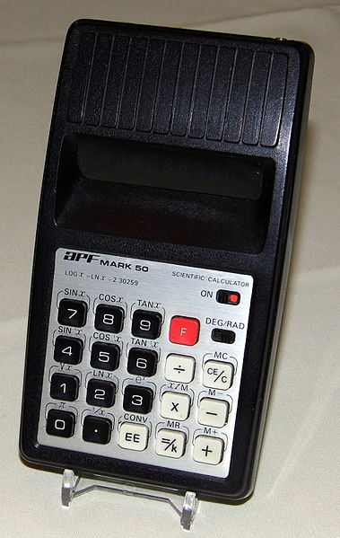 The APF MARK 50 Scientific Calculator is a scientific calculator with 8 digits precision and algebraic logic. It has 17 functions, 19 keys and a VFD (vacuum fluorescent) display. The power source is PP3 9V. The calculator was manufactured in Japan.