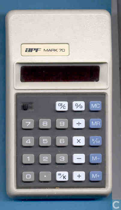 The APF MARK 70 is an arithmetic calculator with unknown digits precision and algebraic logic. It has 5 functions, 23 keys and a VFD (vacuum fluorescent) display. The power source is PP3 9V.