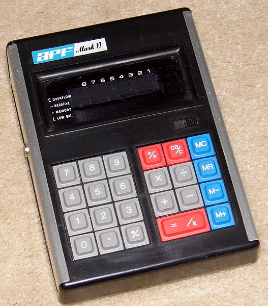 The APF Mark VI is an arithmetic calculator with 8 digits precision and algebraic logic. It has 6 functions, 23 keys and a VFD (vacuum fluorescent) display. The power source is 4xAA batteries.