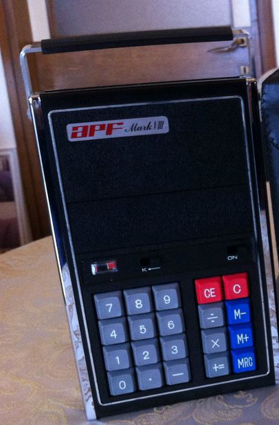 The APF Mark VIII is an arithmetic calculator with 8 digits precision and algebraic logic. It has 4 functions, 20 keys and a VFD (vacuum fluorescent) display. The power source is 4xC.