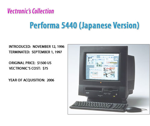 The Apple Macintosh Performa 5440/180, based on the Alchemy architecture, features a 180 MHz PowerPC 603e processor, 24 MB of RAM, and a 1.6 GB hard drive in an attractive all-in-one case with a 15" color monitor. The Performa 5440/180 is similar to the Performa 5400/180, but the 5440/180 shipped in a gray case, instead of a black case. This model was sold in Asia and Europe, but not in the United States.