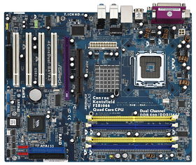 This is the last/best motherboard to have an AGP4X slot @ 1.5V. This board also has a PCI-Express X16 slot too. The versatility continues with the ram. This board accepts DDR or DDR2 memory. However, you cannot operate this board with both DDR & DDR2 memory installed. The installable socket 775 CPU can go up to the first generation Core2Quads from Intel. There is a 5% performance hit per core if a Core2Quad CPU is installed.