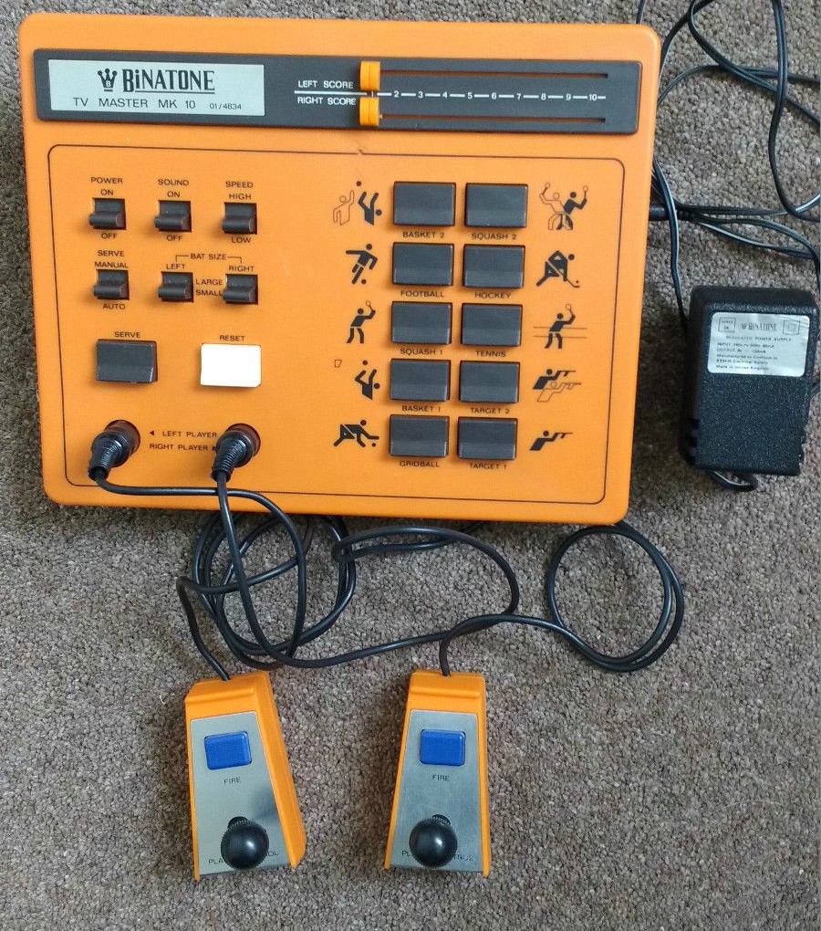 This pong is one of the many Binatone systems. As its name indicates, it offers 10 games : 8 pong games (basket 1, basket 2, gridball, squash 1, squash 2, football, tennis, ice hockey) and 2 shooting games (target 1, target 2). It is the most complete of the Binatone TV Master series (black & white pongs).