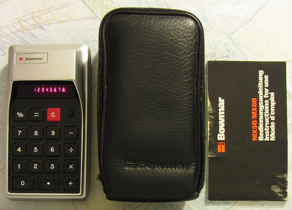 The Bowmar MX60 is an arithmetic calculator with unknown digits precision and algebraic logic. It has an unknown number of functions, unknown keys and an LED (light-emitting diode) display, typical of calculators of this era. The power source is 3xAA batteries.