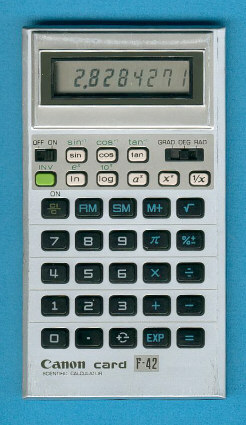 The Canon card F-42 competes with other scientific calculators like the Texas Instruments TI-20 or TI-25. The later F-58 added statistical functions, the F-55S uses a much smaller housing.