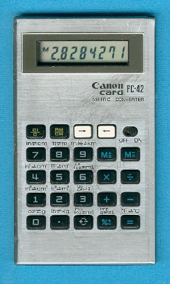 This Canon FC-42 started with its "sibbling" Toshiba LC-838 a long line of Metric Converter calculators based on Integrated Circuits (IC's) developed by Toshiba. Canon introduced already in 1974 with the FC-80 their first metric conversion product with a LED display based on a calculator chip developed by Hitachi.