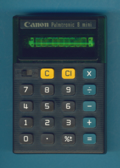 The Canon Palmtronic 8 mini gives roughly the features of the Palmtronic LD-80 introduced about one year earlier. Main difference is the size and weight of the housing.