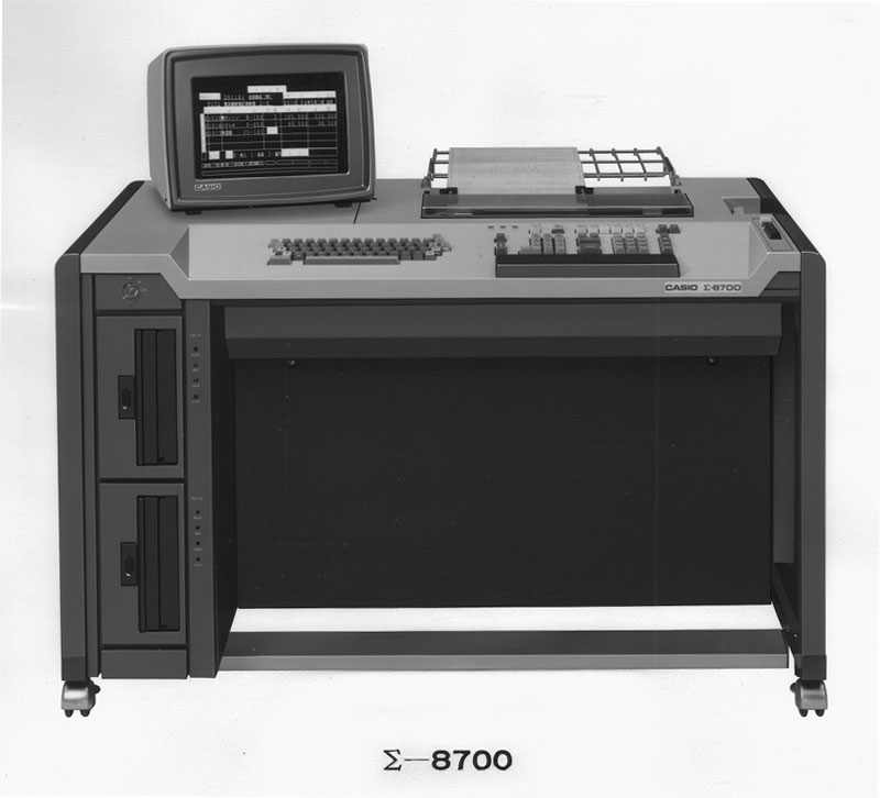 The Casio &Simaga; Series steadily evolved into a true office-computer, with features like a real OS, a high-level language based application programming, multiple processes, communications capability and a CRT. The Σ-8700 "Kanji Office Computer", announced in 1979.