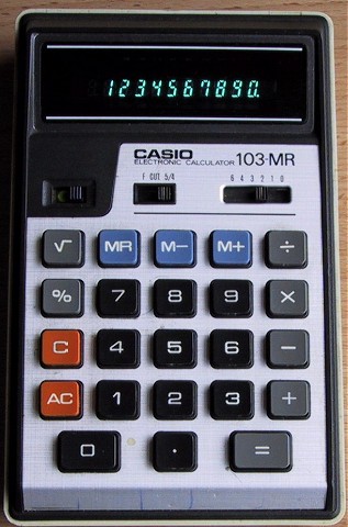 The Casio 103-MR is an arithmetic calculator with 10 digits precision and algebraic logic. It has 6 functions, 23 keys and a VFD (vacuum fluorescent) display. The power source is 4xAA batteries. The calculator was manufactured in Japan.