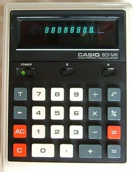 The Casio 801-MR is an arithmetic calculator with 8 digits precision and algebraic logic. It has 8 functions, 23 keys and a VFD (vacuum fluorescent) display. The power source is 4xAA batteries.