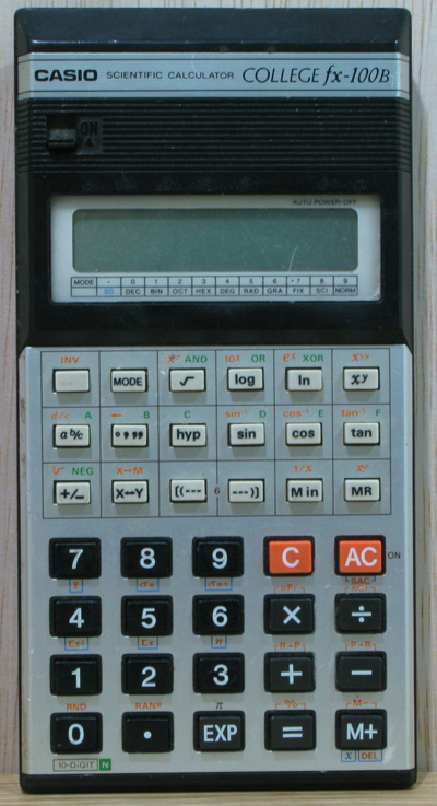 The Casio COLLEGE fx-100B fx-100B is a scientific calculator with 8 digits precision and algebraic logic. It has 58 functions, 38 keys and an LCD (liquid crystal) display. The power source is 2xAA batteries.