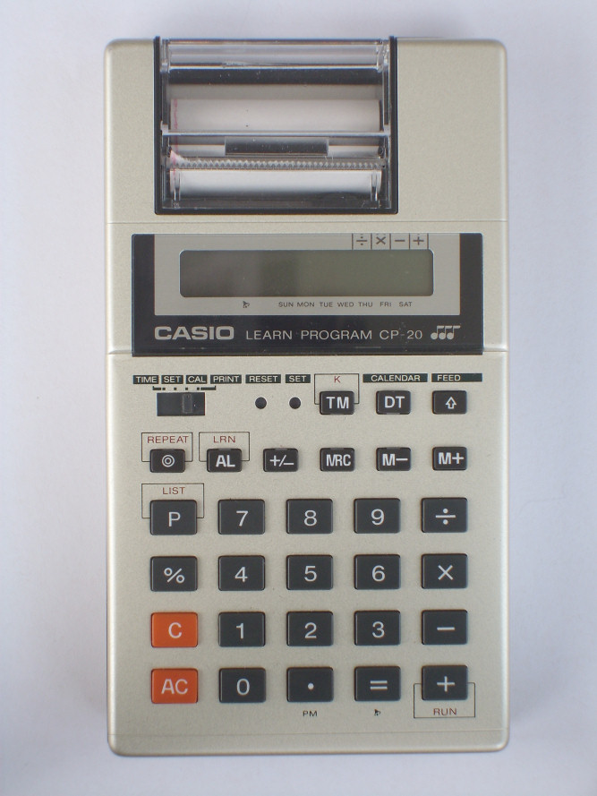 The Casio CP-20 LEARN PROGRAM is an arithmetic calculator with 10 digits precision and algebraic logic. It has 6 functions, 31 keys and an LCD (liquid crystal) display. The power source is 4xAAA battery pack.