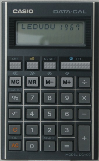 The Casio DC-100 DATA CAL is an arithmetic calculator with 8 digits precision and algebraic logic. It has 6 functions, 28 keys and an LCD (liquid crystal) display. The calculator was manufactured in Japan.