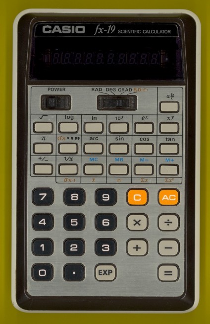 The Casio fx-19 is a scientific calculator with 8 digits precision and algebraic logic. It has 28 functions, 38 keys and a VFD (vacuum fluorescent) display. The power source is 4xAA batteries. The calculator was manufactured in Japan.