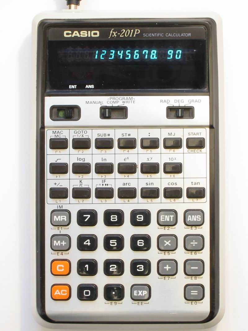 The Casio fx-201P is a programmable calculator with 10 digits precision and algebraic logic. It has an unknown number of functions, 43 keys and a VFD (vacuum fluorescent) display. The power source is 4xAA batteries.