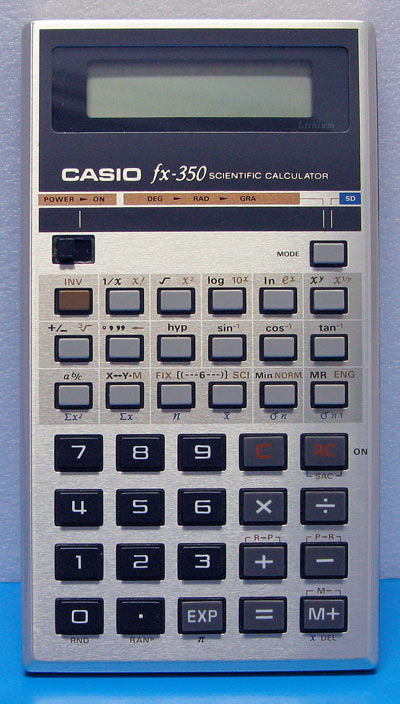 The Casio fx-350 is a scientific calculator with 9 digits precision and algebraic logic. It has 54 functions, 39 keys and an LCD (liquid crystal) display. The power source is 2xLR44.