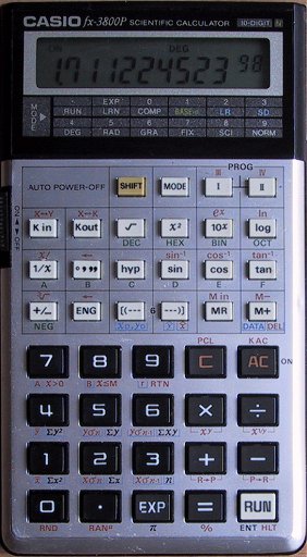 The Casio fx-3800P is a programmable calculator with 10 digits precision and algebraic logic. It has an unknown number of functions, 42 keys and an LCD (liquid crystal) display. The power source is 3V cell.