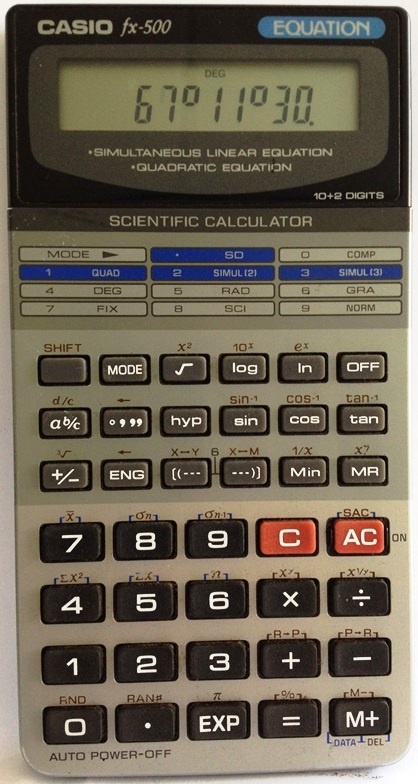 The Casio fx-500 is an arithmetic calculator with unknown digits precision and algebraic logic. It has an unknown number of functions, unknown keys and an LED (light-emitting diode) display, typical of calculators of this era.
