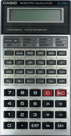 The Casio fx-570C is a scientific calculator with 10 digits precision and algebraic logic. It has 60 functions, 44 keys and an LCD (liquid crystal) display. The power source is LR44 mercury cell. The calculator was manufactured in Japan.