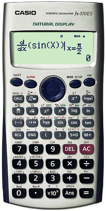 The Casio fx-570ES Natural Display is a scientific calculator with 8 digits precision and formula input logic. It has 403 functions, 50 keys and an LCD (liquid crystal) display. The power source is mercury cell. The calculator was manufactured in China.