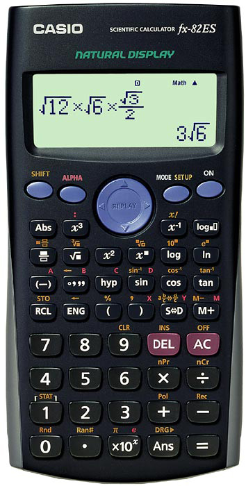 The Casio fx-82ES Natural Display is a scientific calculator with 10 digits precision and formula input logic. It has 249 functions, 50 keys and an LCD (liquid crystal) display. The power source is AAA batteries. The calculator was manufactured in China.