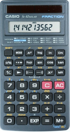 The Casio fx-82SOLAR FRACTION is a scientific calculator with unknown digits precision and algebraic logic. It has an unknown number of functions, 38 keys and an LCD (liquid crystal) display. The power source is Solar. The calculator was manufactured in China.