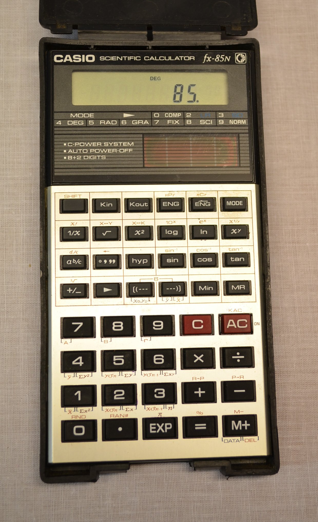 The Casio fx-85N is a scientific calculator with 8 digits precision and algebraic logic. It has an unknown number of functions, 44 keys and an LCD (liquid crystal) display. The power source is Solar. The calculator was manufactured in Japan.