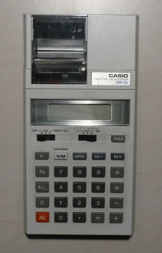 The Casio HR-10 is an arithmetic calculator with 10 digits precision and algebraic logic. It has 6 functions, 26 keys and an LCD (liquid crystal) display. The power source is 4xAA batteries. The calculator was manufactured in Japan.