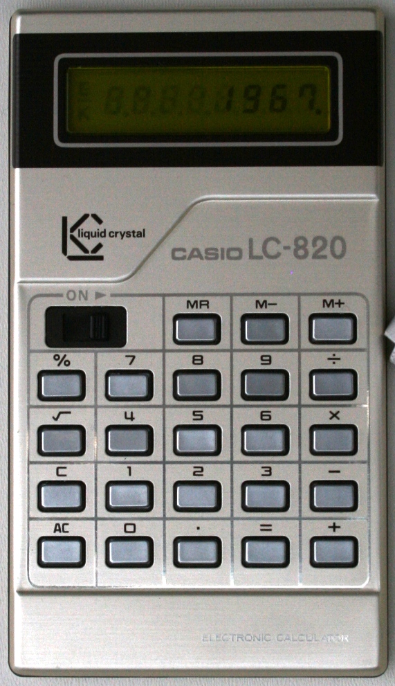 The Casio LC-820 is an arithmetic calculator with 8 digits precision and algebraic logic. It has 6 functions, 23 keys and one of the early LCD (liquid crystal) displays which incorporated a yellow filter. The power source is 3x1.5V cell.