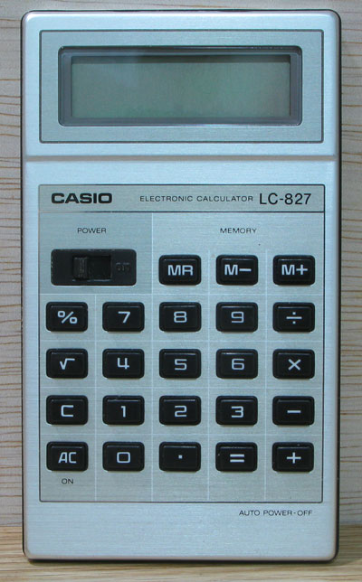 The Casio LC-827 is an arithmetic calculator with 8 digits precision and algebraic logic. It has 6 functions, 23 keys and an LCD (liquid crystal) display. The power source is 2x1.5V cell. The calculator was manufactured in Japan.
