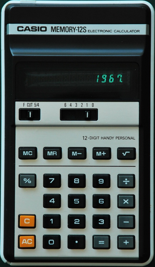 The Casio MEMORY-12S H-1211 is an arithmetic calculator with 12 digits precision and algebraic logic. It has 6 functions, 24 keys and a VFD (vacuum fluorescent) display. The power source is 2xAA batteries. The calculator was manufactured in Japan.