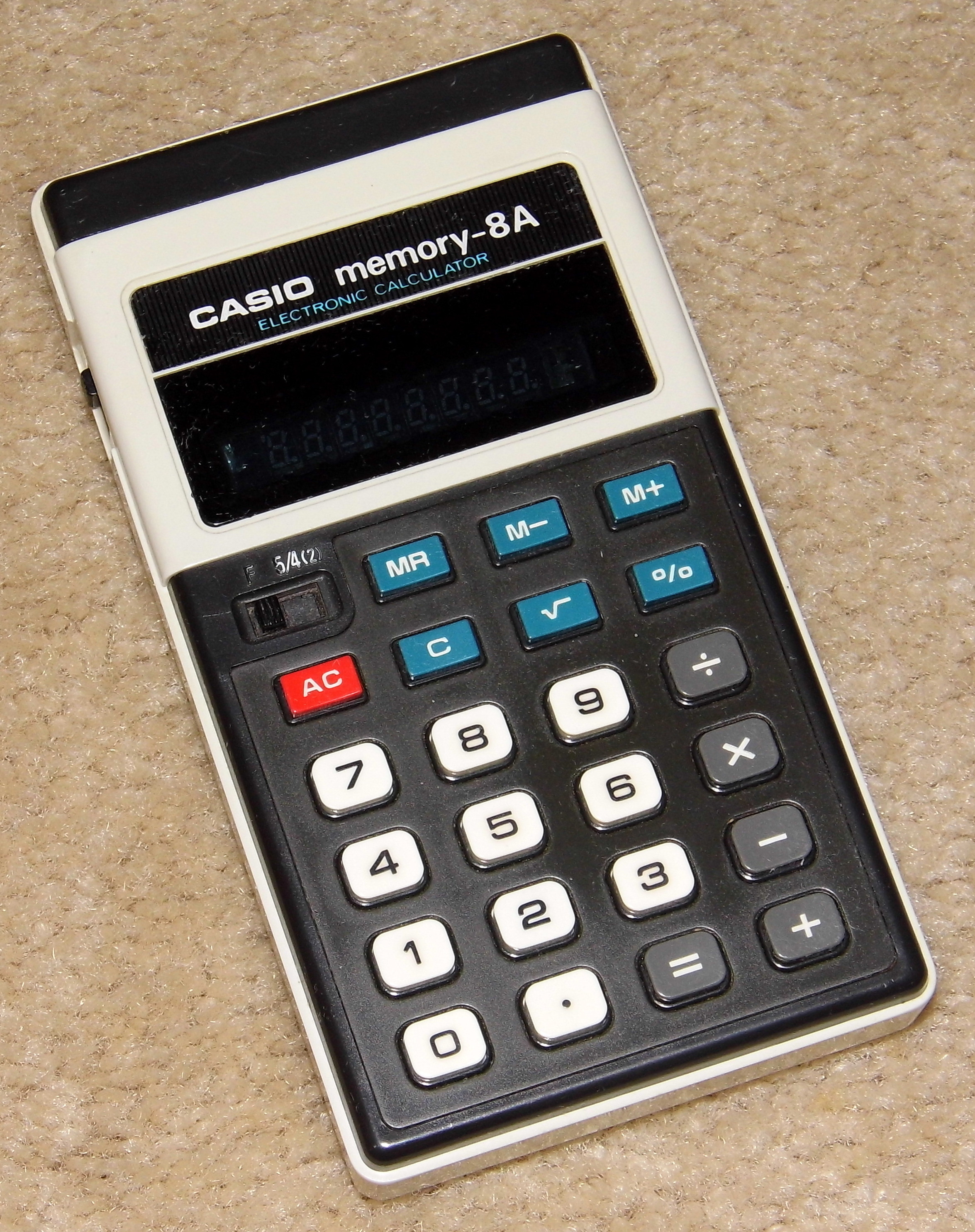 The Casio memory-8A CD-813 is an arithmetic calculator with 8 digits precision and algebraic logic. It has 6 functions, 23 keys and a VFD (vacuum fluorescent) display. The power source is 2xAA batteries. The calculator was manufactured in Japan.