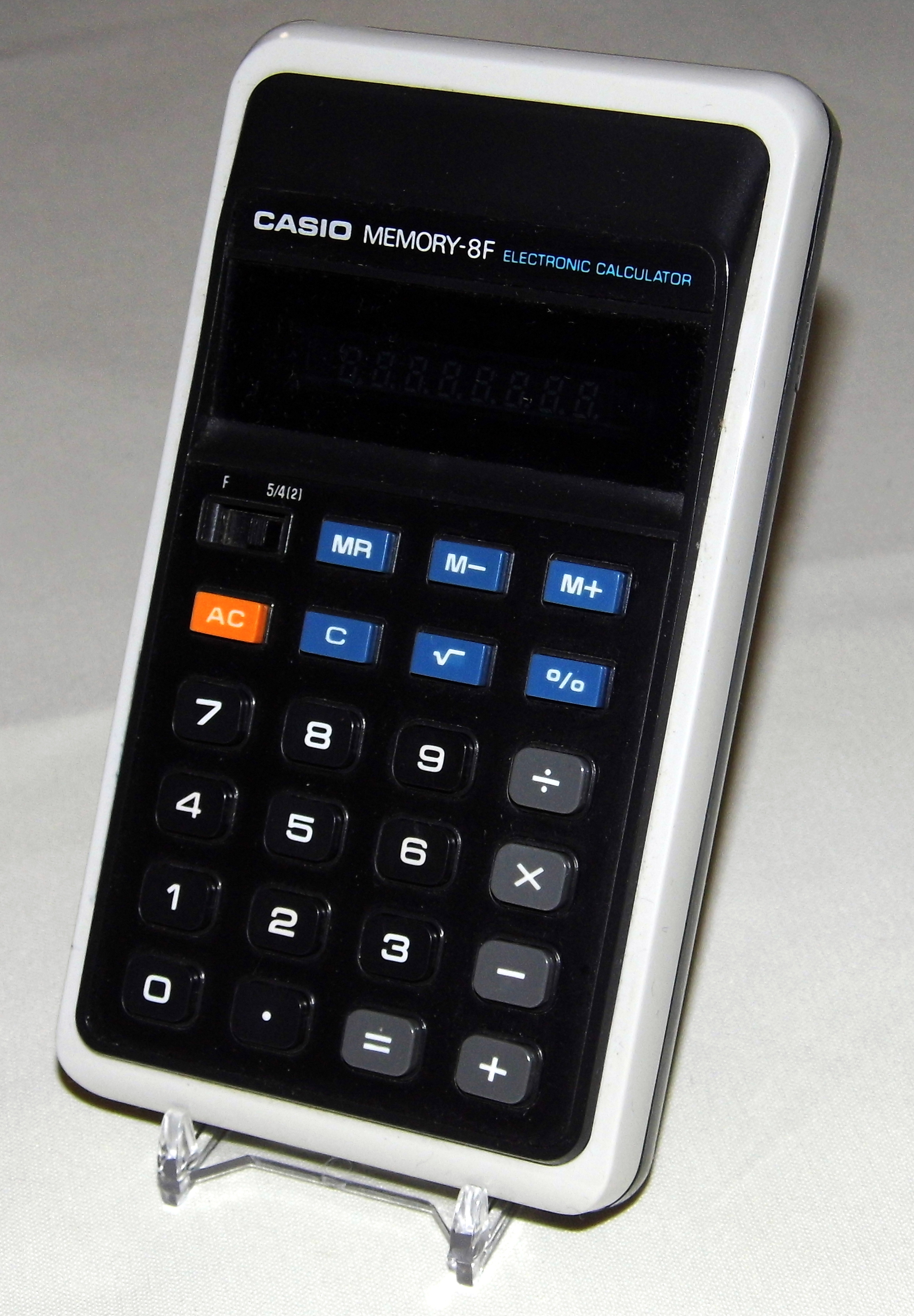 The Casio MEMORY-8F H-812 is an arithmetic calculator with 8 digits precision and algebraic logic. It has 6 functions, 23 keys and a VFD (vacuum fluorescent) display. The power source is 2xAA batteries. The calculator was manufactured in Japan.