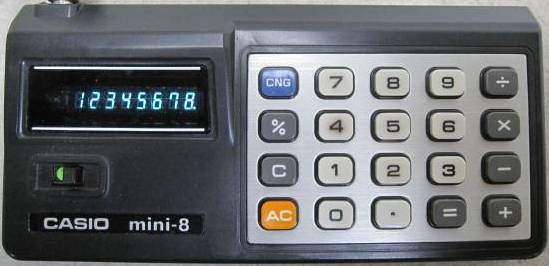 The Casio mini-8 Y-800 is an arithmetic calculator with 8 digits precision and algebraic logic. It has 6 functions, 20 keys and a VFD (vacuum fluorescent) display. The power source is 2xAA batteries. The calculator was manufactured in Japan.