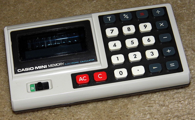 The Casio MINI MEMORY is an arithmetic calculator with 8 digits precision and algebraic logic. It has 6 functions, 22 keys and a VFD (vacuum fluorescent) display. The power source is 4xAA batteries. The calculator was manufactured in Japan.