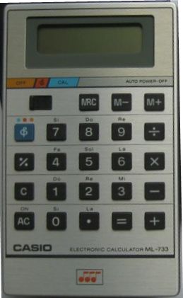 The Casio ML-733 is an arithmetic calculator with 8 digits precision and algebraic logic. It has 6 functions, 23 keys and an LCD (liquid crystal) display. The power source is 2x1.5V cell. The calculator was manufactured in Japan.