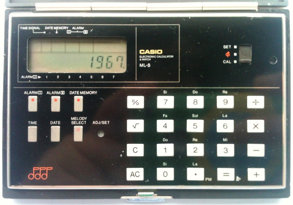 The Casio ML-8 is an arithmetic calculator with 8 digits precision and algebraic logic. It has an unknown number of functions, 27 keys and an LCD (liquid crystal) display.