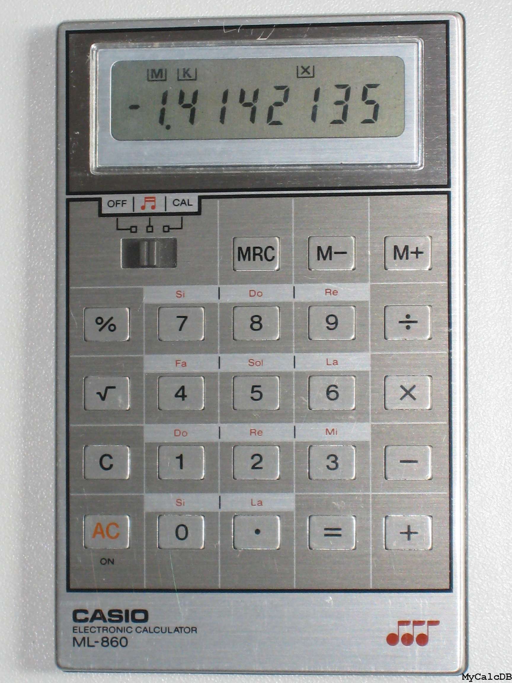 The Casio ML-860 is an arithmetic calculator with 8 digits precision and algebraic logic. It has 6 functions, 23 keys and an LCD (liquid crystal) display. The power source is 2xLR1130.