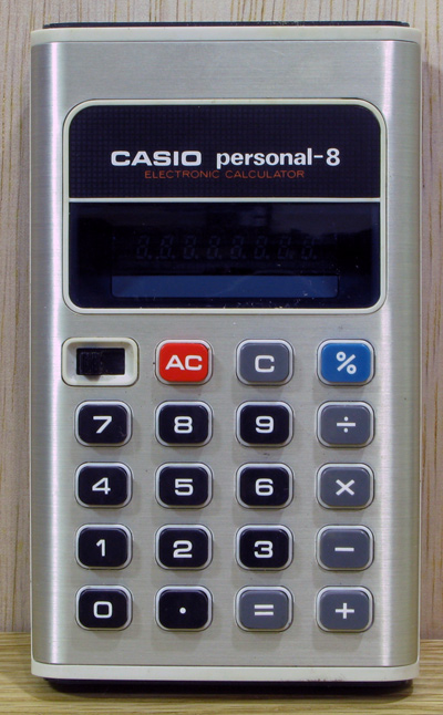 The Casio personal-8 is an arithmetic calculator with 8 digits precision and algebraic logic. It has 5 functions, 19 keys and a VFD (vacuum fluorescent) display. The power source is 2xAA batteries. The calculator was manufactured in Japan.