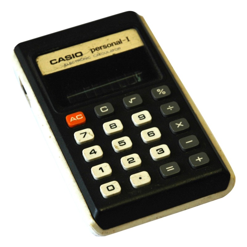 The Casio personal-I H-802 is an arithmetic calculator with 8 digits precision and algebraic logic. It has 6 functions, 20 keys and a VFD (vacuum fluorescent) display. The power source is 2xAA batteries. The calculator was manufactured in Japan.