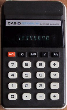 The Casio PERSONAL M-1 H-813 is an arithmetic calculator with 8 digits precision and algebraic logic. It has 6 functions, 21 keys and a VFD (vacuum fluorescent) display. The power source is 2xAA batteries. The calculator was manufactured in Japan.