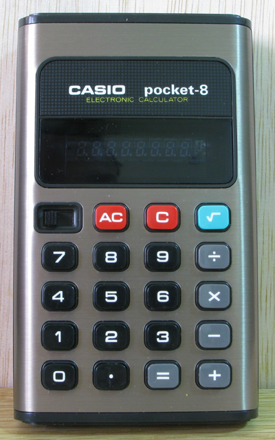 The Casio pocket-8 is an arithmetic calculator with unknown digits precision and algebraic logic. It has an unknown number of functions, unknown keys and a VFD (vacuum fluorescent) display. The power source is 2xAA batteries.
