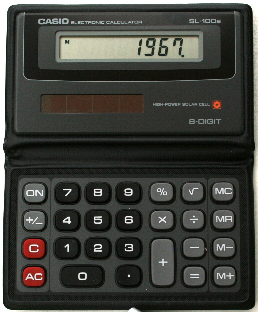 The Casio SL-100B is an arithmetic calculator with 8 digits precision and algebraic logic. It has 7 functions, 24 keys and an LCD (liquid crystal) display. The power source is Solar. The calculator was manufactured in Japan.