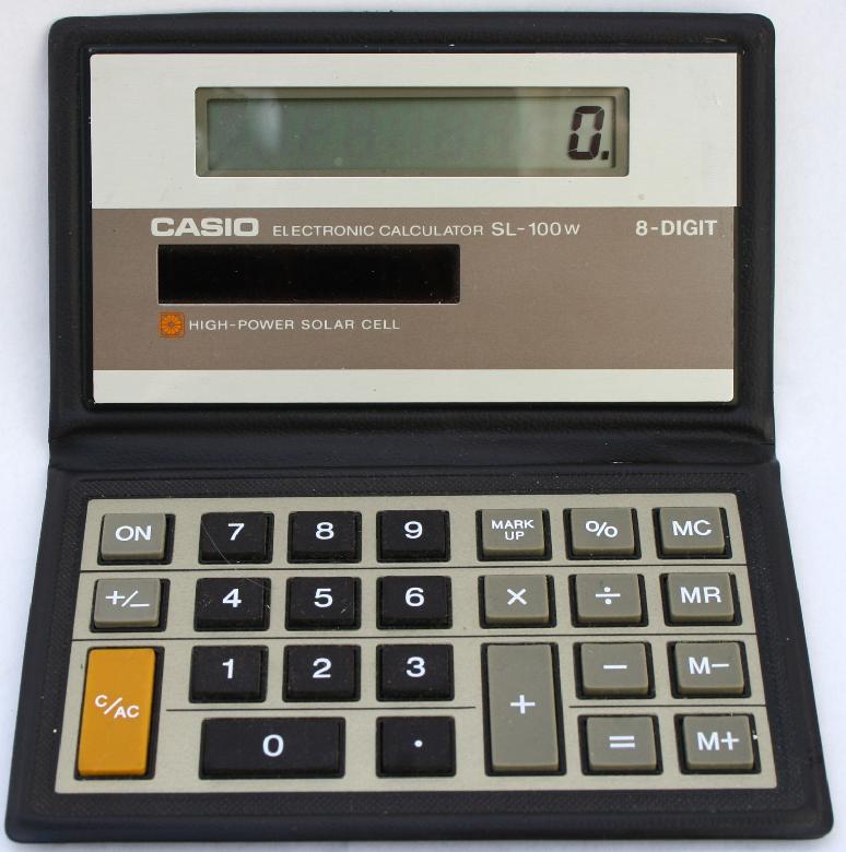 The Casio SL-100W is an arithmetic calculator with 8 digits precision and algebraic logic. It has 7 functions, 25 keys and an LCD (liquid crystal) display. The power source is Solar. The calculator was manufactured in Japan.