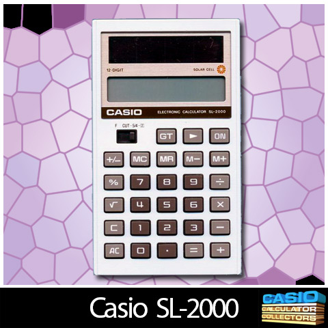 The Casio SL-2000 is an arithmetic calculator with 12 digits precision and algebraic logic. It has 9 functions, 28 keys and an LCD (liquid crystal) display. The power source is Solar.