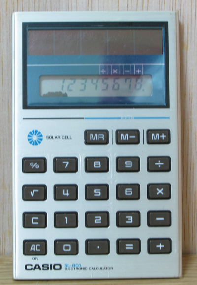 The Casio SL-801 is an arithmetic calculator with 8 digits precision and algebraic logic. It has 6 functions, 23 keys and an LCD (liquid crystal) display. The power source is Solar.